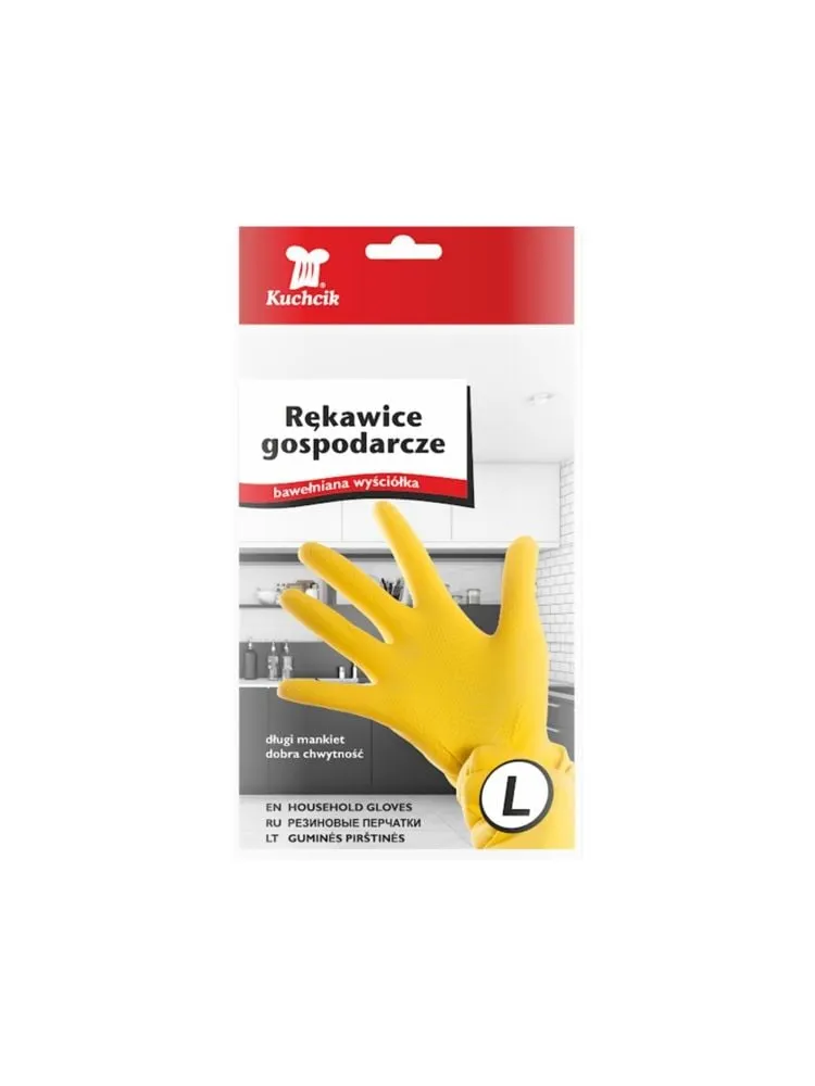 Protejează-ți mâinile și brațele în timpul treburilor casnice și activităților de grădinărit cu Mănușile de uz casnic Kuchcik, mărimea L. Concepute pentru confort și siguranță, aceste mănuși protejează pielea împotriva detergentilor agresivi, umidității, tăieturilor minore și a temperaturilor moderate (până la 50°C).